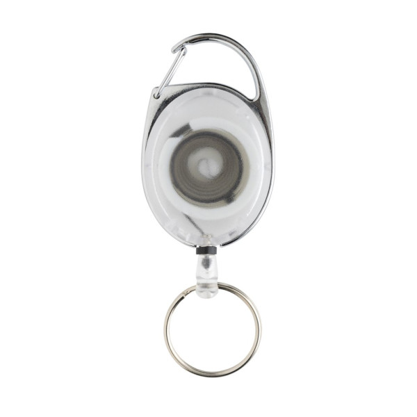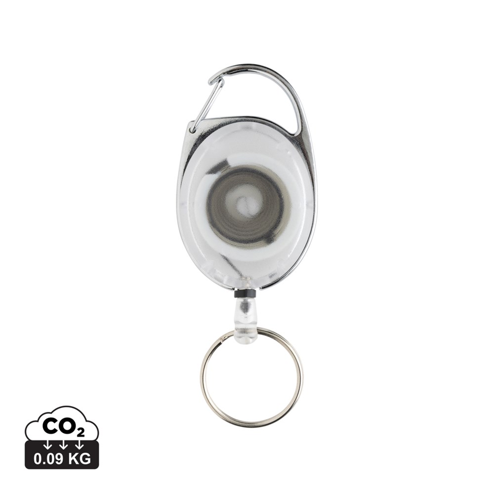 Rolclip-sleutelhanger gemaakt van RCS-gerecycled ABS en zinklegering. Ideaal item voor op kantoor, op een beurs of zelfs tijdens het skiën. Met koord van 60 cm om badge te bevestigen voor gemakkelijke toegang. Met karabijnhaak voor bevestiging aan tas of kleding. Totaal gerecycled materiaal: 34% op basis van het totale gewicht van het item. RCS-certificering zorgt voor een volledig gecertificeerde toeleveringsketen van de gerecyclede materialen. Verpakt in papieren zak.
