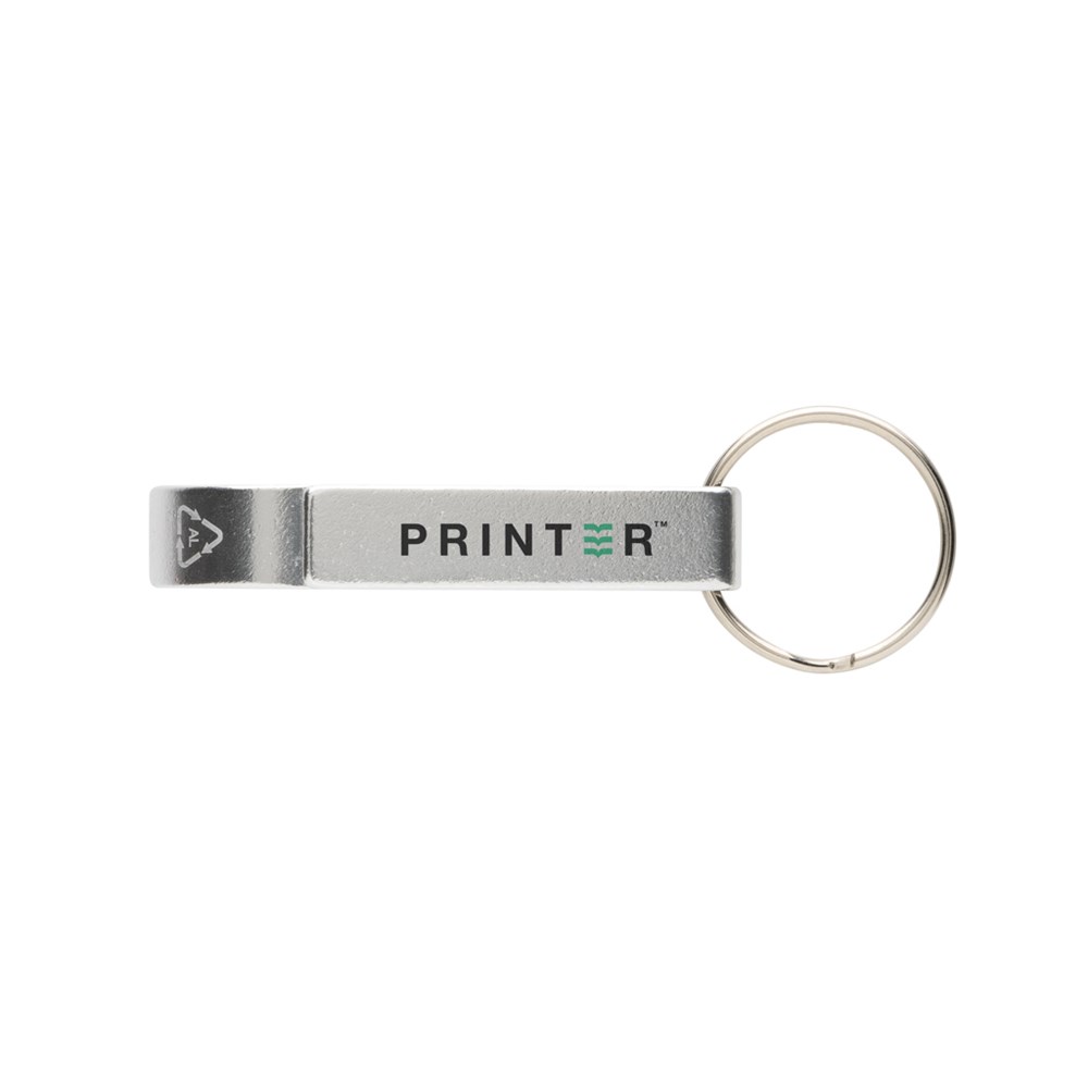 Sterke fles- en blikopener-sleutelhanger gemaakt van RCS-gerecycled aluminium. Totaal gerecycled materiaal: 79% op basis van het totale gewicht van het item. RCS-certificering zorgt voor een volledig gecertificeerde toeleveringsketen van de gerecyclede materialen. Verpakt in papieren zak.