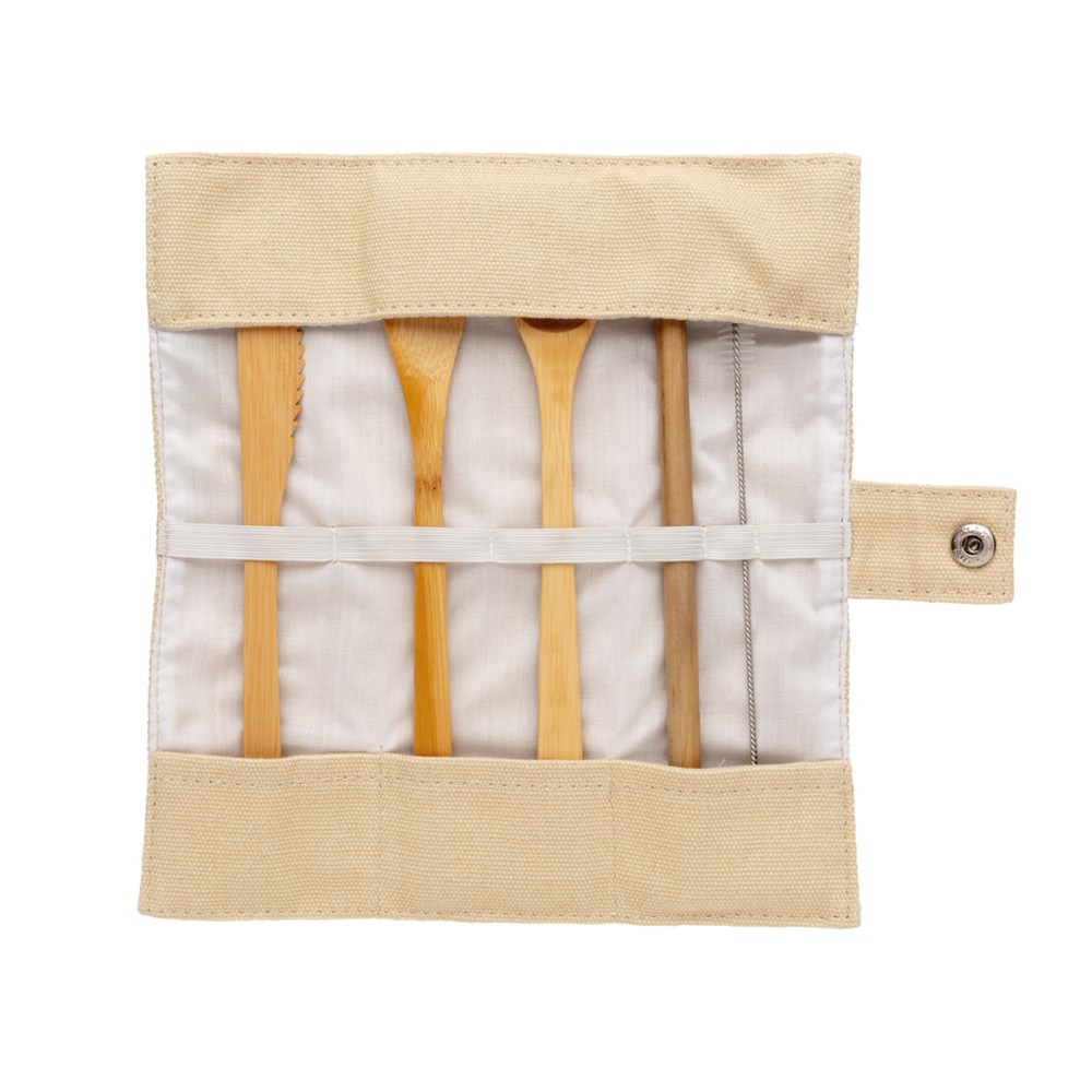 Breng je eigen herbruikbare bamboe bestek mee. Verminder plastic afval en help onze planeet te beschermen. De set bevat een lepel, vork, mes, rietje en schoonmaak borstel. Prachtig verpakt in canvas etui.
