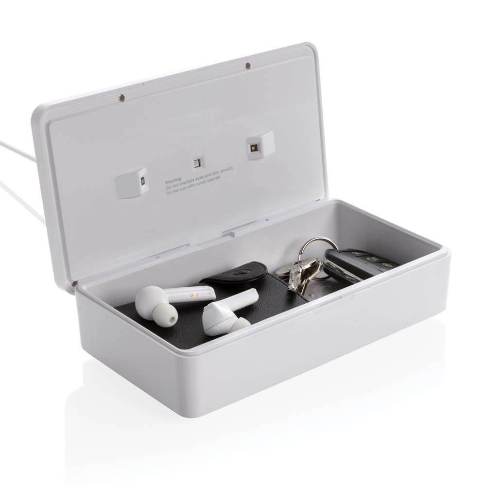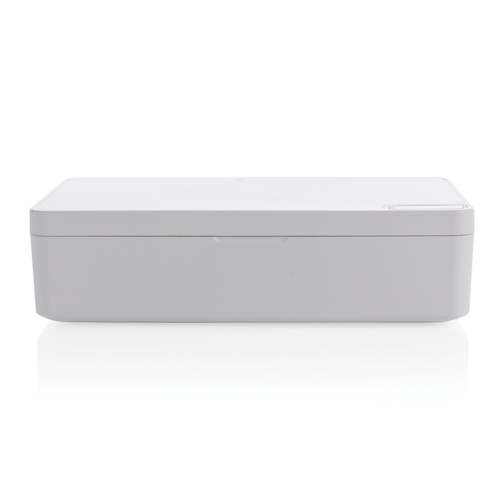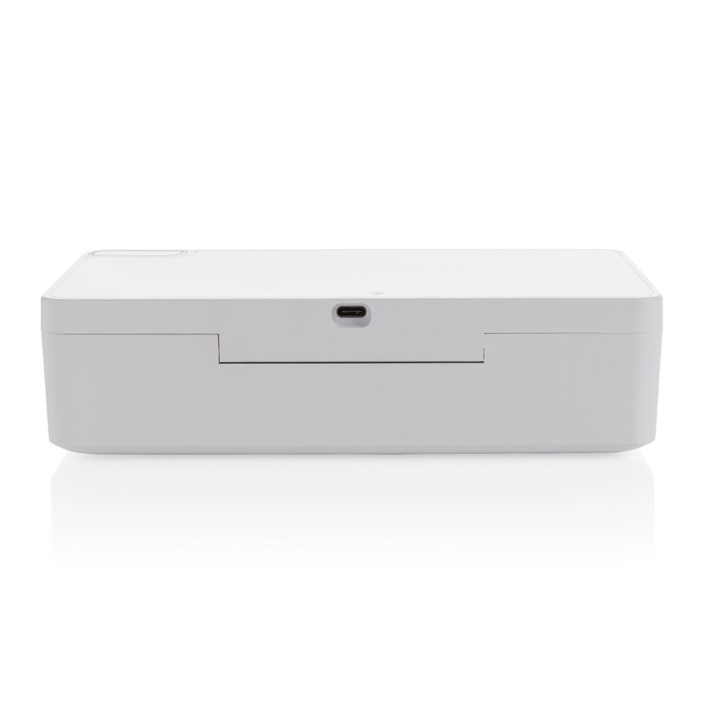 Multifunctionele UV-C-sterilisator die tot 99,9% van de bacteriën op objecten die in het apparaat worden geplaatst elimineert. Plaats voorwerpen zoals uw mobiele telefoon, oordopjes, sieraden, horloges en gezichtsmasker in de sterilisator om ze te steriliseren met behulp van UV-C-technologie. U kunt ervoor kiezen om een snelle reiniging in 90 seconden uit te voeren of een volledige reiniging in 5 minuten. De 2 UV-C LED-lichten binnenin zijn gemaakt zonder giftige stoffen zoals kwik zoals veel UV-lampen op de markt. Het ontwerp zorgt er ook voor dat het UV-C led licht automatisch uit gaat als de box wordt geopend zodat de gebruiker niet wordt blootgesteld aan het UV-C licht. De lampen hebben een levenscyclus van 10.000 uur. Inclusief 100 cm PVC-vrije TPE type C kabel. Input 5V/1.5A
