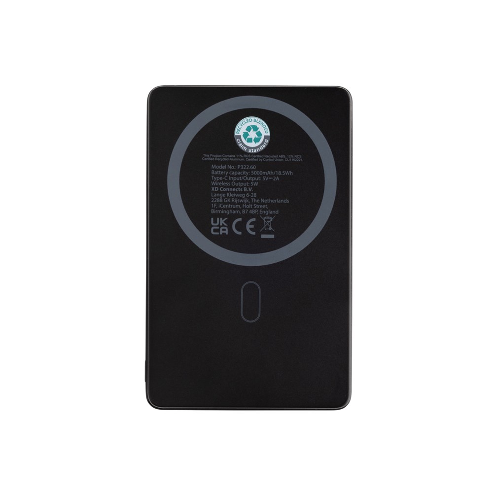 5.000 mAh ultradunne powerbank met een 5W magnetische draadloze oplader, waarbij de behuizing is gemaakt van RCS-gecertificeerd gerecycled aluminium en gerecycled ABS-plastic. RCS (Recycled Claim Standard) is een norm om het gerecyclede gehalte van een product door de hele toeleveringsketen te verifiëren. Totaal gerecycled gehalte: 23% op basis van het totale productgewicht. De powerbank bevat een duurzame grade A 5.000 mAh lithium-polymeerbatterij. De stroomindicatoren geven het resterende energieniveau aan, zodat je altijd weet wanneer je moet opladen. Type-C Input: 5V/2.4A; USB C output: 5V/2A. Het artikel en de accessoires zijn PVC-vrij. Inclusief RCS-gecertificeerde gerecyclede TPE-oplaadkabel. Verpakt in FSC® mix verpakking.