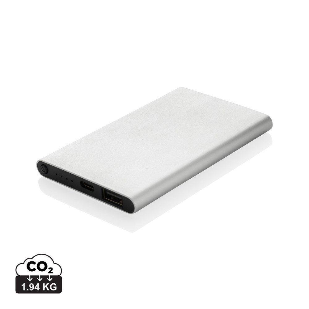 4.000 mAh powerbank met plat ontwerp, waarvan de behuizing is gemaakt van RCS-gecertificeerd gerecycled aluminium/ABS-plastic. RCS (Recycled Claim Standard) is een standaard om de gerecyclede inhoud van een product gedurende de hele toeleveringsketen te verifiëren. Totale gerecyclede inhoud: 36% op basis van het totale gewicht van het artikel. De powerbank ondersteunt opladen via zowel USB A als type C. De powerbank bevat een duurzame grade A 4.000 mAh lithium-polymeerbatterij. De energie-indicatoren geven het resterende energieniveau aan, zodat je altijd weet wanneer je moet opladen. Type-C invoer: 5V/2A; Type-C uitvoer: 5V/2A; USB A uitvoer: 5V/2A. Artikel en accessoires zijn PVC-vrij. Inclusief RCS-gecertificeerde gerecyclede TPE-oplaadkabel. Verpakt in FSC® mix verpakking