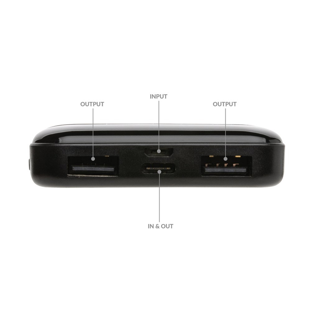 5.000 mAh zakformaat powerbank waarvan de behuizing is gemaakt van RCS-gecertificeerd gerecycled ABS-plastic. RCS (Recycled Claim Standard) is een standaard om de gerecyclede inhoud van een product te verifiëren gedurende de hele toeleveringsketen. Totaal gerecycled materiaal: 30% op basis van het totale gewicht van het artikel. Wanneer de powerbank volledig is opgeladen, biedt deze voldoende energie om uw mobiele telefoon tot twee keer op te laden. De powerbank bevat een duurzame grade A 5.000 mAh high-density lithium-polymeerbatterij. De energie-indicatoren geven het resterende energieniveau aan, zodat u altijd weet wanneer u moet opladen. Micro-USB-ingang 5V/2A; Type-C ingang 5V/2.4A; USB-uitgang 5V/2.4A, Type C-uitgang: 5V/2A. Artikel en accessoires zijn PVC-vrij. Inclusief RCS-gecertificeerde gerecyclede TPE-oplaadkabel. Verpakt in FSC® mix-verpakking.