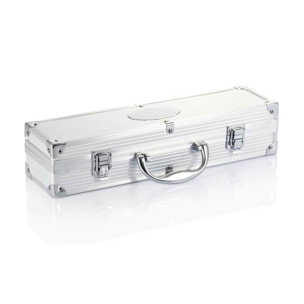3-delige roestvrijstalen set in aluminium koffer inclusief spatel, tang en vork.