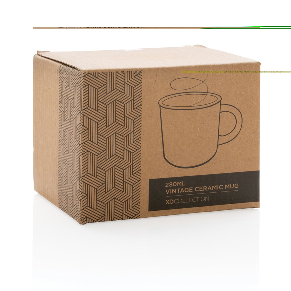 Deze mok is gemaakt van keramiek voor duurzaamheid en langdurig gebruik. De mok heeft een vintage look en is voorzien van een gebogen handvat voor een gemakkelijke grip. De mok is vaatwasmachinebestendig en is getest in overeenstemming met EN12875-1 (minimaal 125 wasbeurten) voor alle decoratiemethoden. Verpakt in een geschenkdoos. Capaciteit 280 ml.