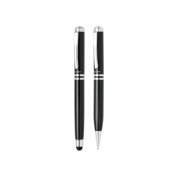 Authentieke pennenset met alle kenmerken van klassieke kwaliteit. Kwalitatief hoogwaardige zware messing metalen rollerball met stylus en balpen met Swiss Peak branding. Inclusief premium PU lederen etui en giftbox. Blauwe vulling.