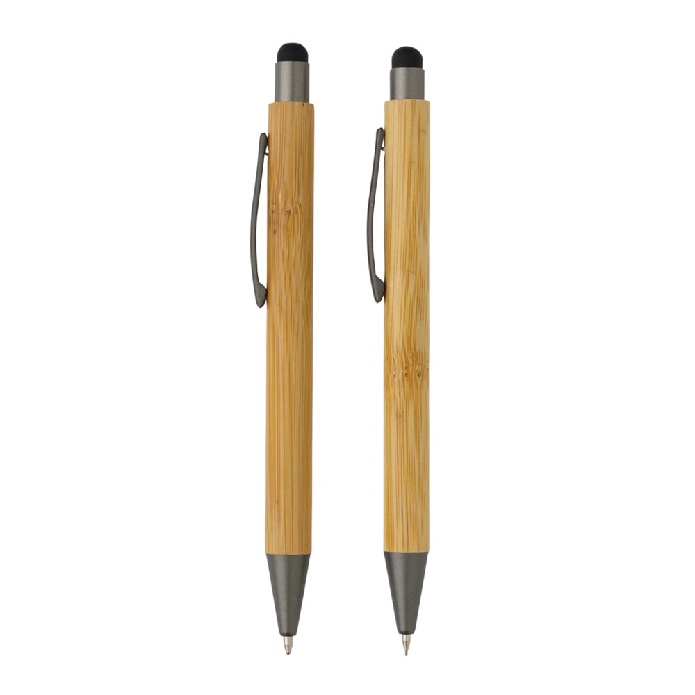 Deze modern ogende pennenset met balpen en potlood is gemaakt van FSC®-gecertificeerd bamboe. De pen heeft een schrijfvulling van 800 m met blauwe Duitse inkt en het potlood heeft een stift van 0,7 mm. Verpakt in FSC®-gecertificeerde geschenkdoos.