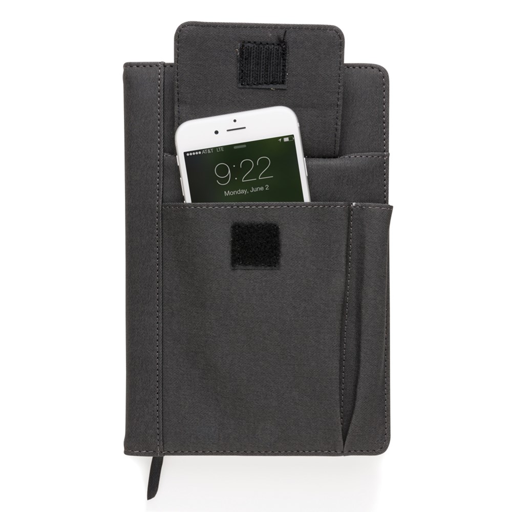 Gecoate PU omslag voor notitieboek met voorvak voor telefoon (14x10 cm.), pennenvak en hoofdcompartiment voor bijvoorbeeld een powerbank of visitekaartjes. Het notitieboek heeft een zwarte paginaverdeler en 160 pagina’s van 80g/m2 papier. U kunt het notitieboek moeiteloos vervangen, zodat u eindeloos plezier heeft van deze omslag.
