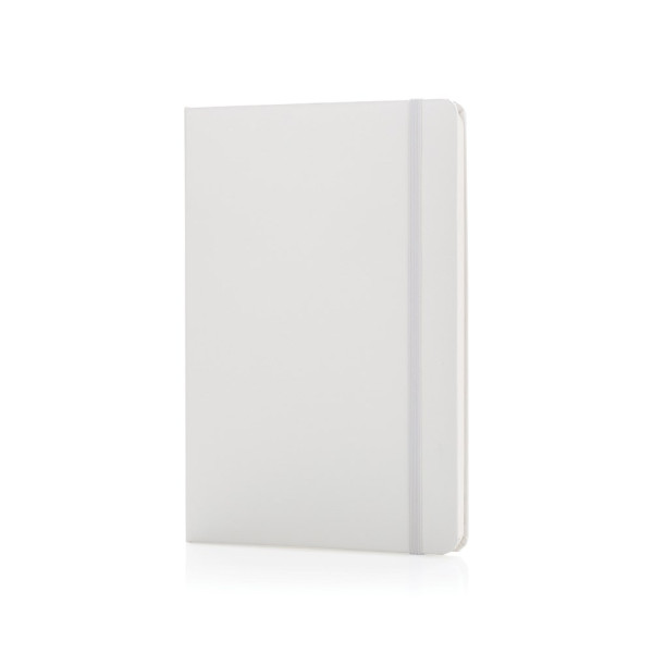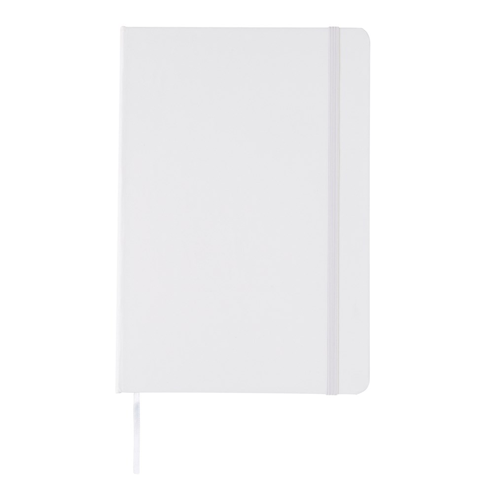 A5 hardcover gelinieerd notitieboek met elastieken band sluiting en bladwijzer. 144 pagina’s van 70g/m2.