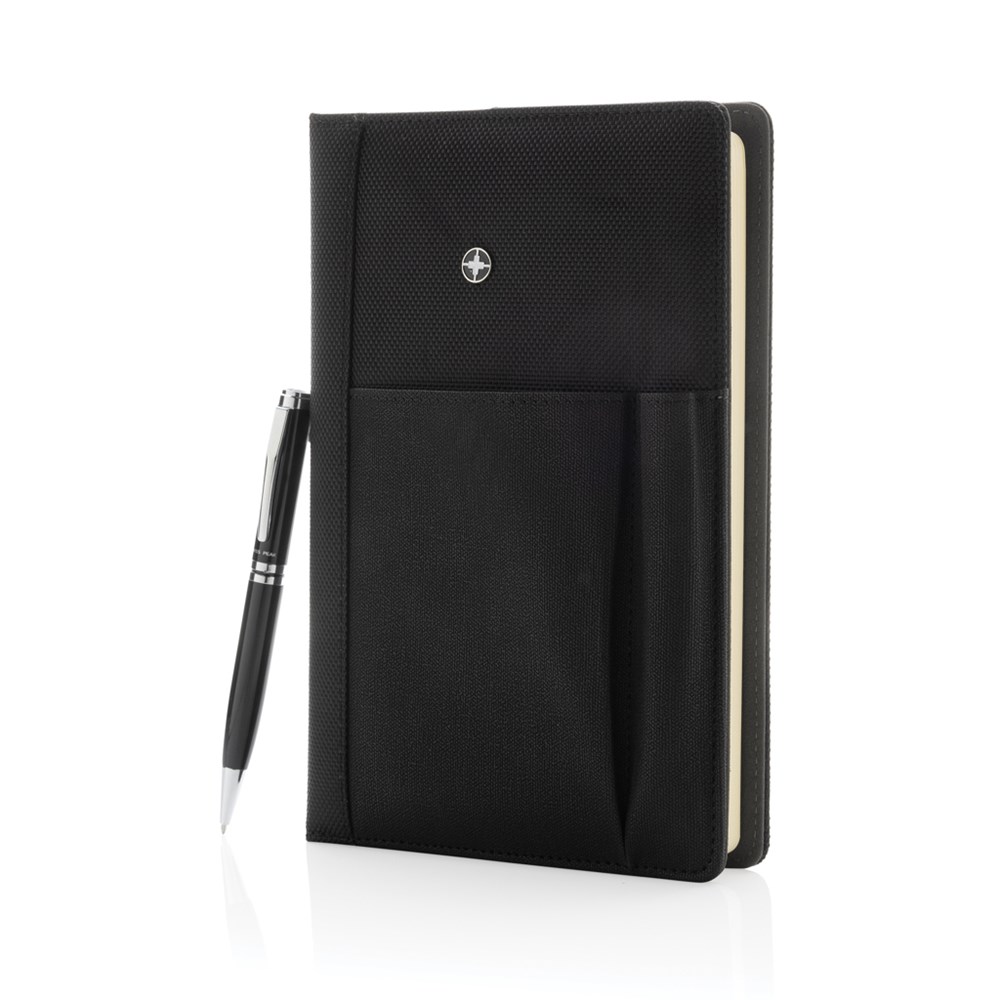 Executive 1680D en 600D polyester Notitieboek omslag met pen. Inclusief vervangbaar A5 notitieboek met 192 pagina’s van 80g/m2. Voorvak op omslag is geschikt voor pen, kaarten, contant geld, mobiele telefoon enz. Verpakt in Swiss Peak geschenkverpakking