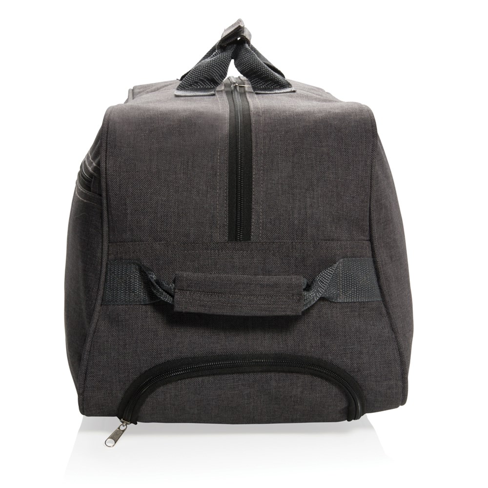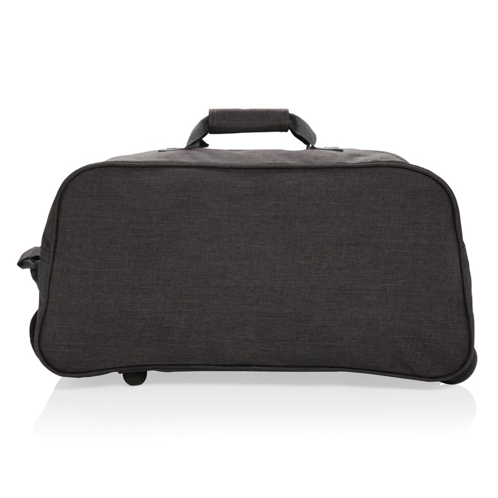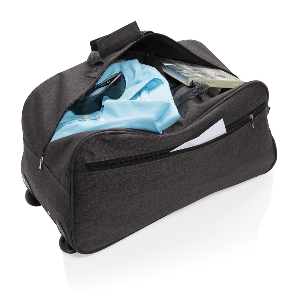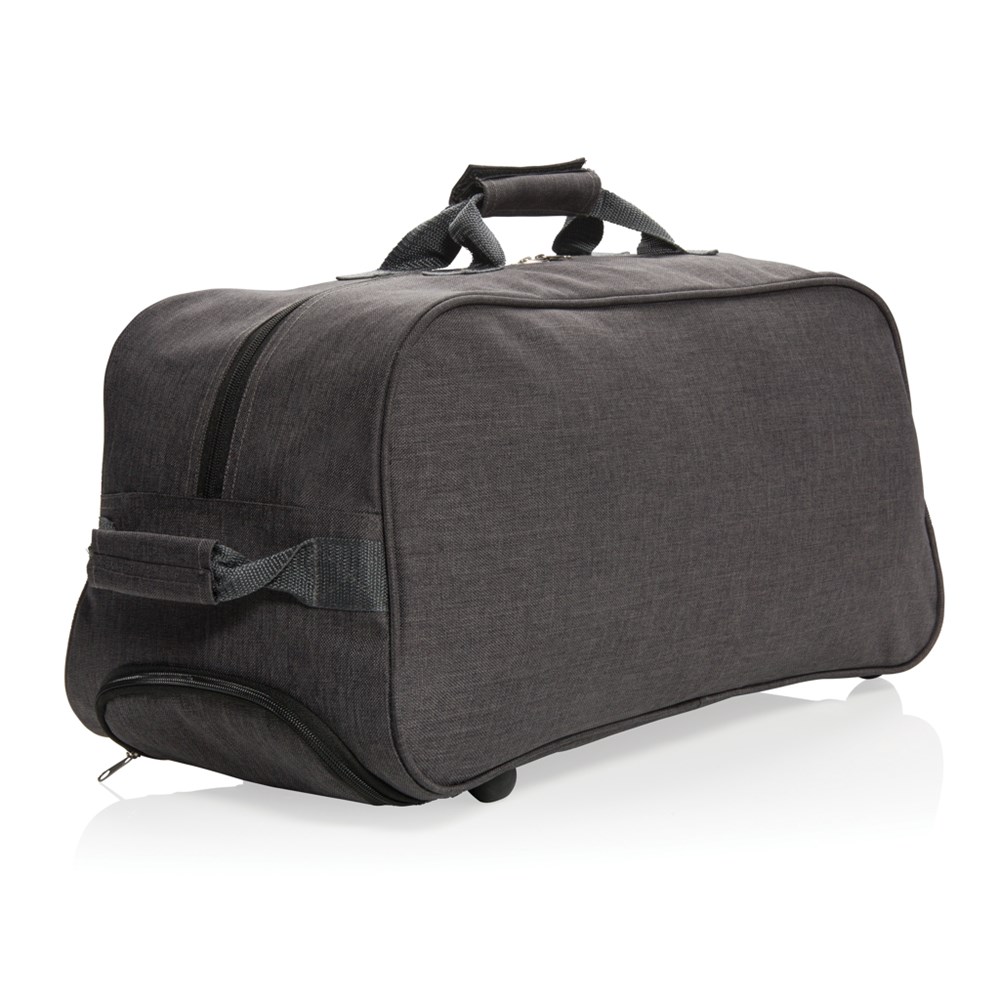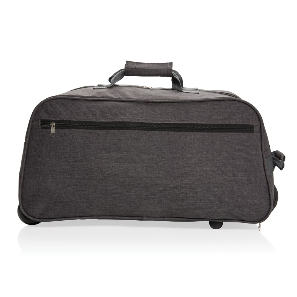 600D extra sterke two tone polyester stof. Uittrekbaar trolleysysteem. Groot hoofd- en voor compartiment met ritssluiting.