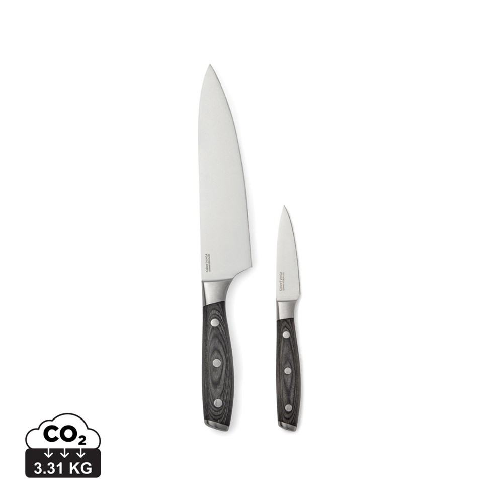 Set bestaande uit een koksmes en schilmes. Het mes is vervaardigd van Duits staal X50CrMoV15 en het handvat is van pakkahout. Het handvat ligt makkelijk in de hand en de goede vormgeving van het gehele mes zorgt ervoor dat het fijn en eenvoudig is in gebruik.