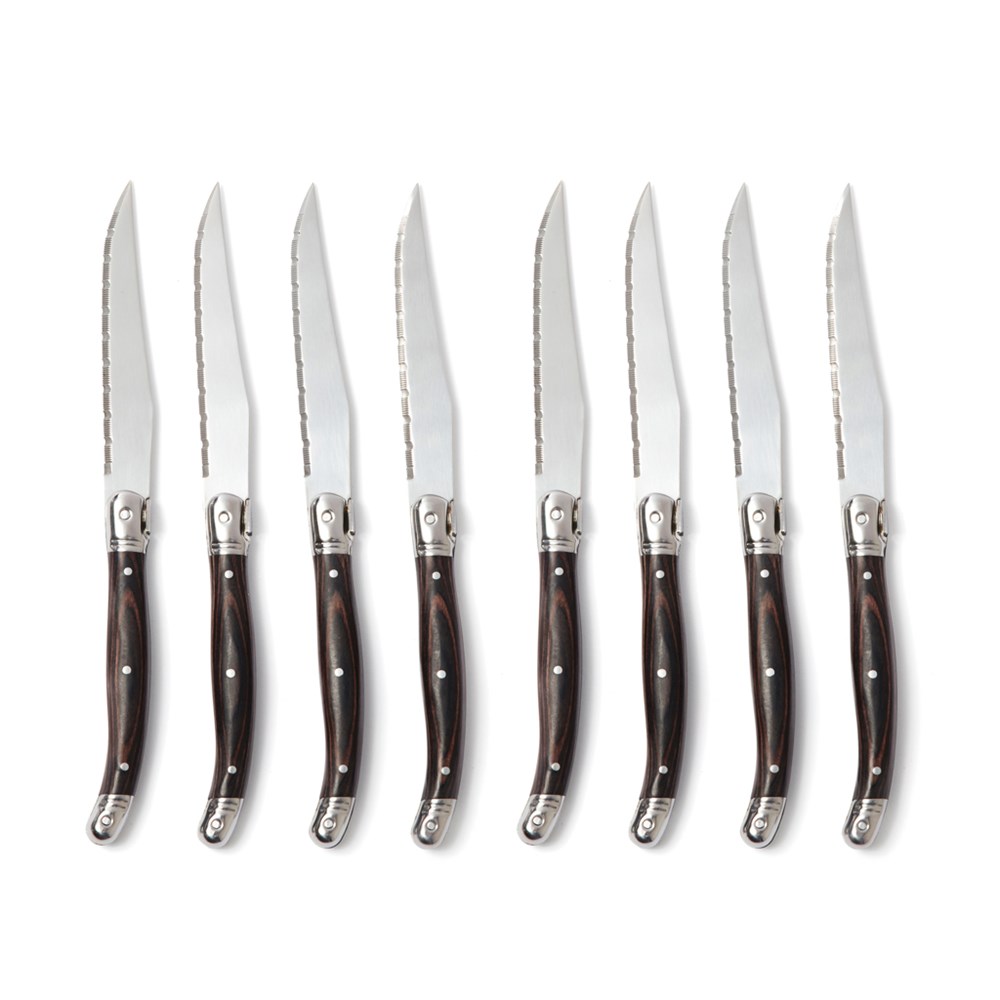 Set van vier vleesmessen in typisch Franse bistrostijl van hoge kwaliteit. Ieder heft is gemaakt van zwart pakkahout en het lemmet van hoogwaardig roestvrijstaal. Het mes is super scherp waardoor je met zo min mogelijk weerstand door het vlees snijdt. Combineer deze steakmessen met vorken die je thuis al hebt. Wordt geleverd in een luxe geschenkverpakking.