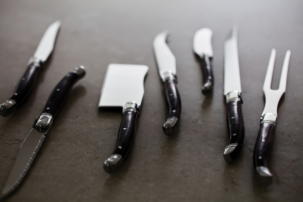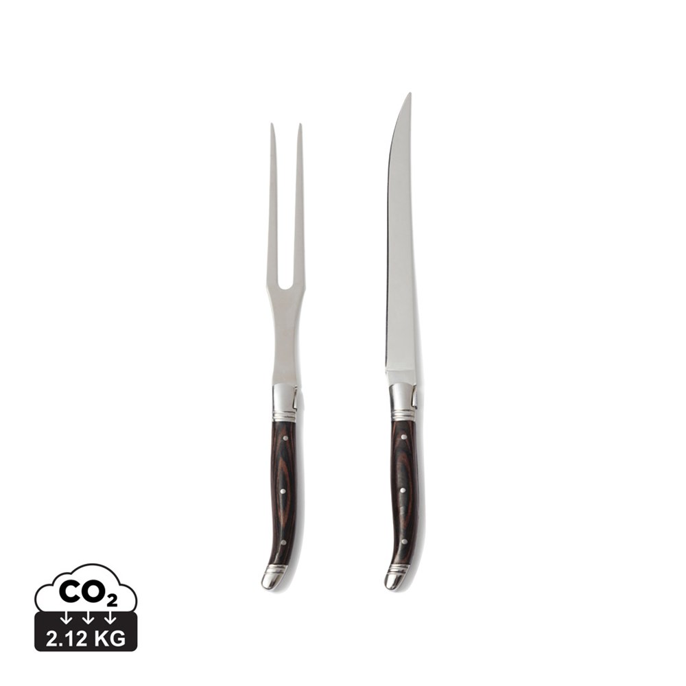 Een trancheerset in typisch Frans geïnspireerde bistro-stijl. Gemaakt van roestvrijstaal. De handvaten van het koksmes en de vleesvork zijn gemaakt van zwart pakkahout . Wordt geleverd in een luxe geschenkverpakking.