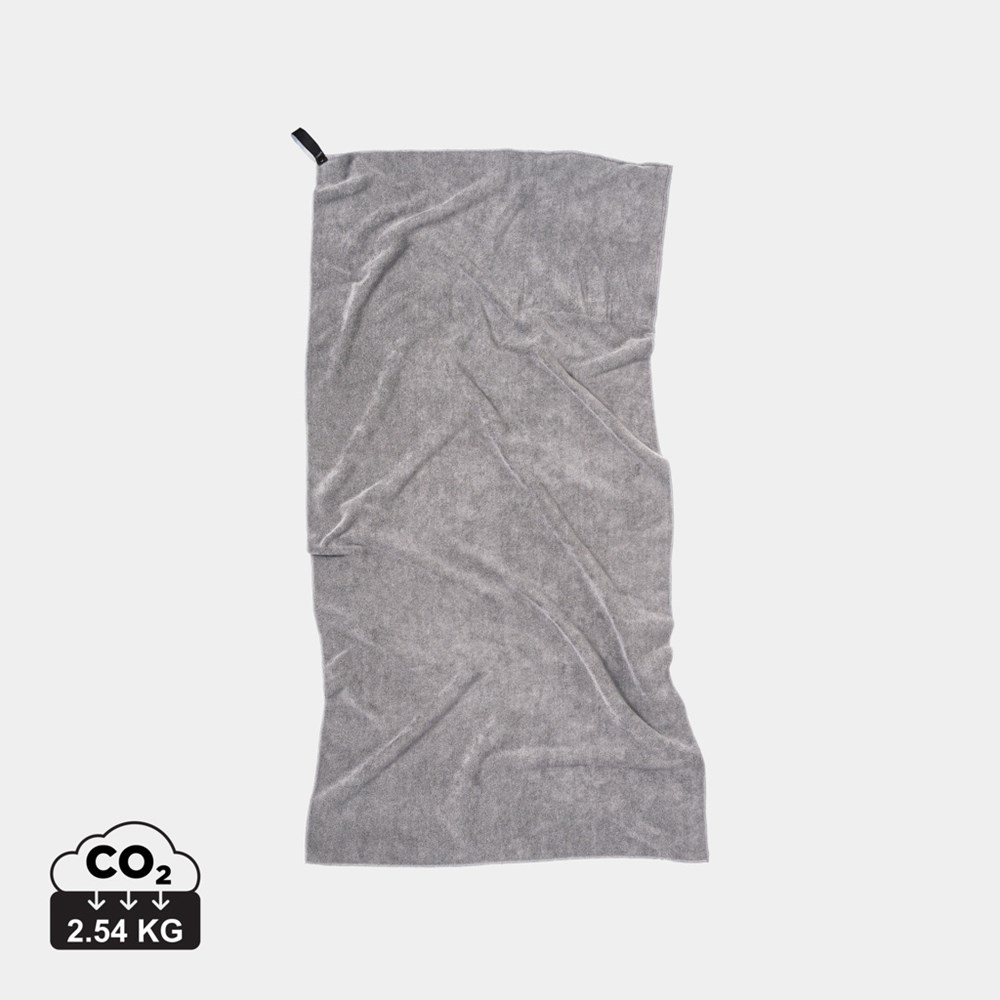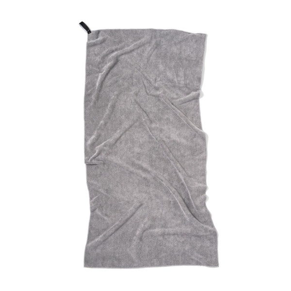 Microvezel sporthanddoek gemaakt van gerecyclede PET-flessen. Door het unieke badstofgevoel absorbeert deze handdoek meer water en droogt hij drie keer sneller dan een traditionele handdoek. Zeer geschikt voor buitenactiviteiten en sport. Lichtgewicht en compact, de handdoek is een ideaal formaat voor op reis of in de sportschool. Gemaakt van 52% GRS (Global Recycle Standard) gecertificeerde gerecyclede materialen, waarbij de GRS-certificering een volledig gecertificeerde toeleveringsketen van gerecyclede materialen garandeert. Totale gerecyclede inhoud gebaseerd op het totale productgewicht.