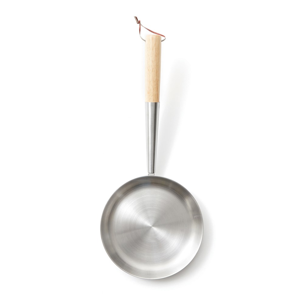 Een typisch Zweedse outdoor pan die geplaatst kan worden op een van keien of stenen gemaakte barbecue. De staalkleurige pan wordt verpakt in een opbergtas.