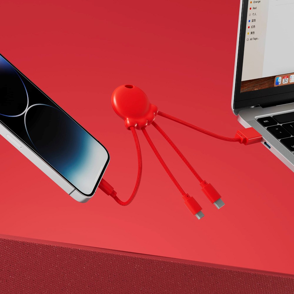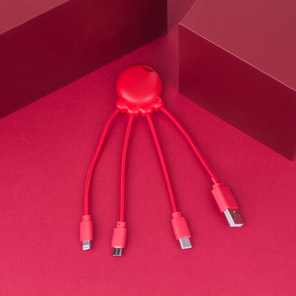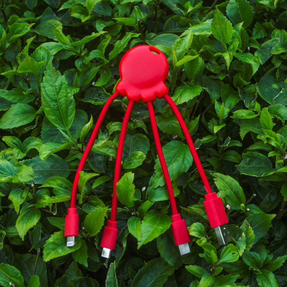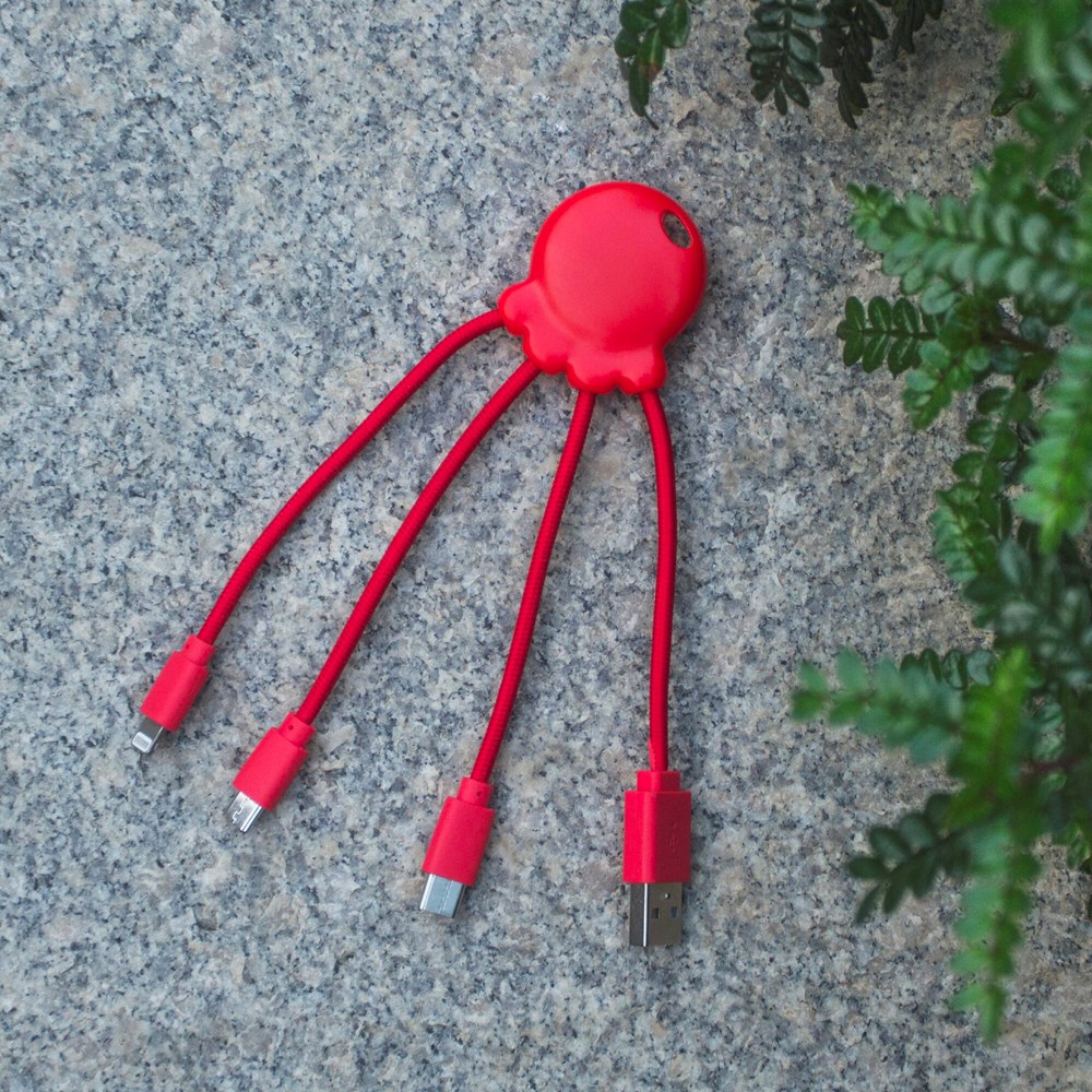 De Eco Octopus oplaadkabel is gemaakt van RPET (kabels) en gerecycled plastic (behuizing). Met één USB-ingang en drie verschillende connectoren kun je je apparaten op een milieuvriendelijke manier opladen. Op je bureau, in de auto, in je tas of op vakantie; deze multi-oplaadkabel komt altijd van pas! Het totale gerecyclede materiaal is 61% op basis van het gewicht van het artikel. De kabel is verpakt in een duurzame FSC-gecertificeerde papieren envelop.