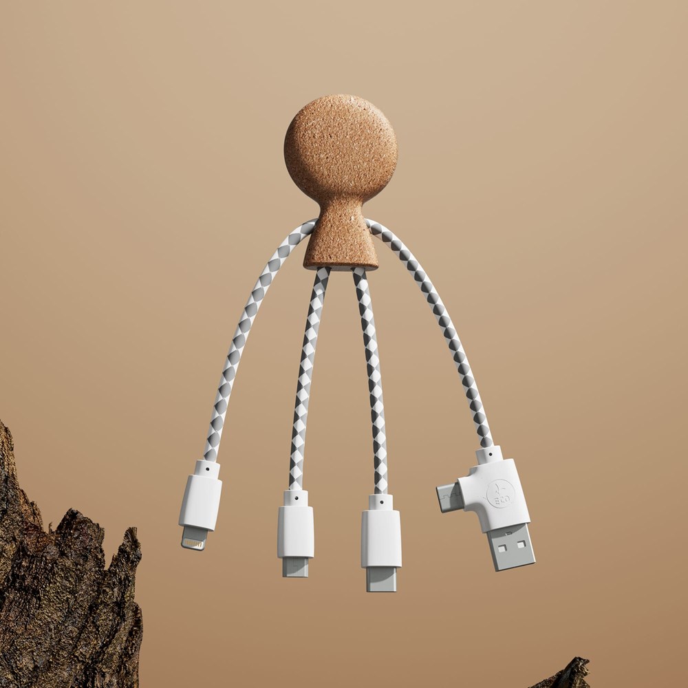Mr. Bio Cork is onze nieuwste multi-oplaadkabel, met een dubbele USB & USB-C ingangsconnector en drie connectoren om je apparaten op te laden. Hij is gemaakt van kurk en DuPont Tyvek kabels. Hij is verpakt in een stijlvolle, duurzame envelop van FSC-papier.