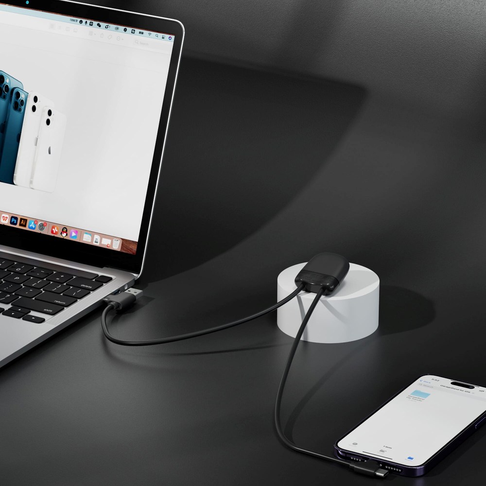 De 27Watt ICE-C oplaadkabel is onze nieuwste multi-oplaadkabel, met een dubbele USB & USB-C ingang en een dubbele USB-C & lightning uitgang. De kabel heeft een lengte van twee keer 50 cm en ondersteunt gegevensoverdracht en autoplay. De totale gerecyclede inhoud is 55% gebaseerd op het gewicht van het artikel. De kabel is verpakt in een duurzame FSC-gecertificeerde papieren envelop.