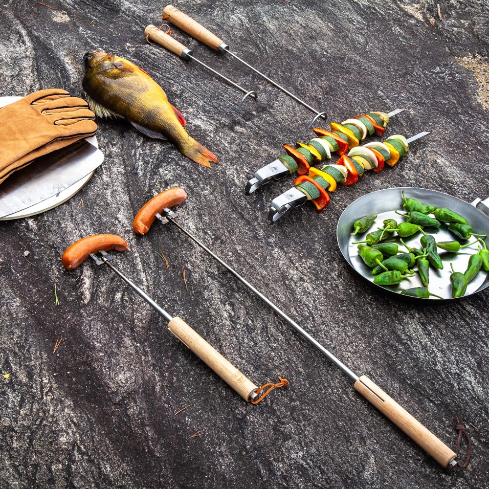 De Fredde vork is uitschuifbaar, grillbestendig en uitermate geschikt voor het grillen van worstjes en groenten en marshmallows boven open vuur. Gemaakt van roestvrij staal met een handvat van rubberhout. Neemt minimale ruimte in wanneer het niet wordt gebruikt.