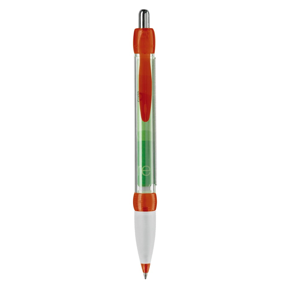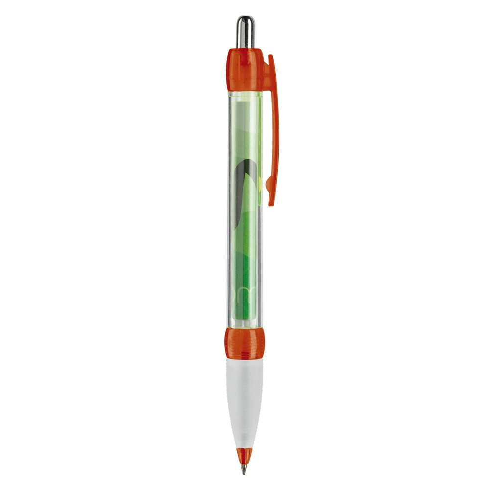 Transparante balpen met rubberen grip. Met full-colour banner bedrukking aan twee zijden. Blauwschrijvende X20 vulling. Bedrukking op de houder of clip mogelijk.