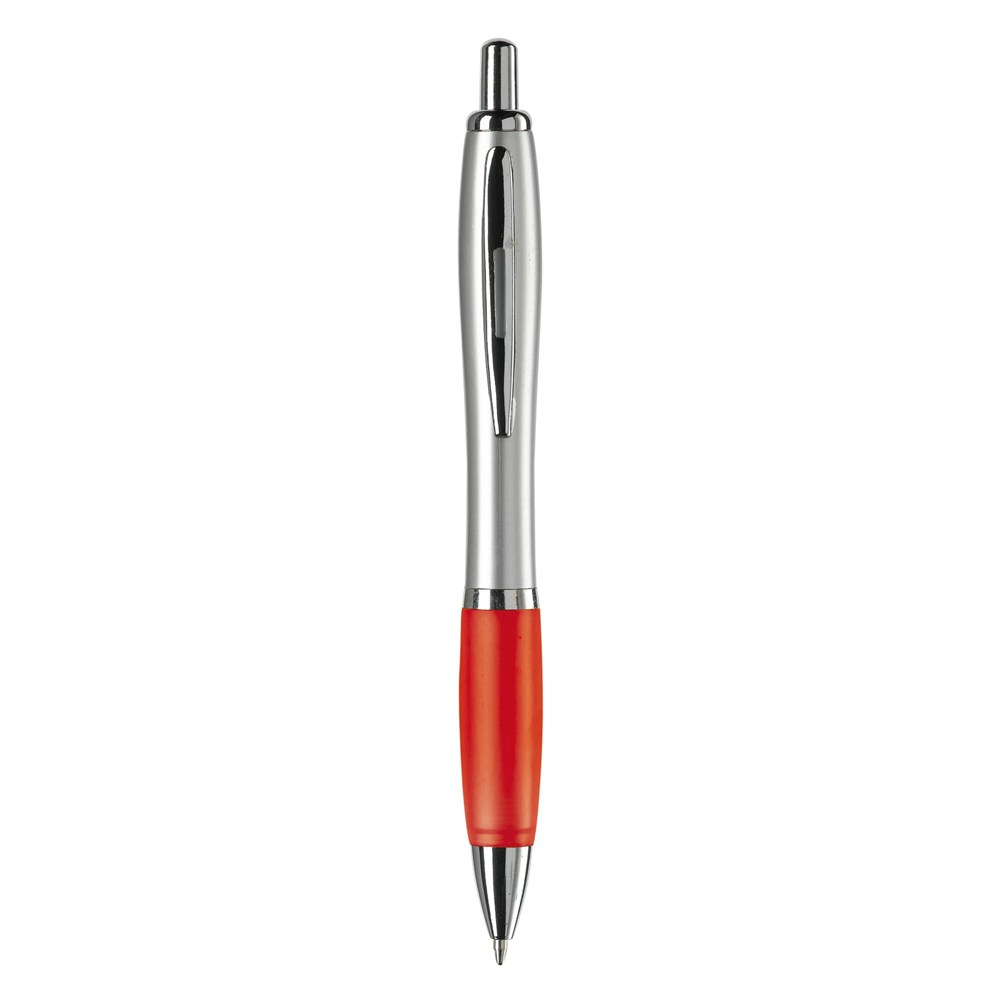 Zilveren balpen met metalen clip, gekleurde grip en een 'metal-look' drukknop, ring en punt. De pen bevat een blauwschrijvende Jumbo vulling.