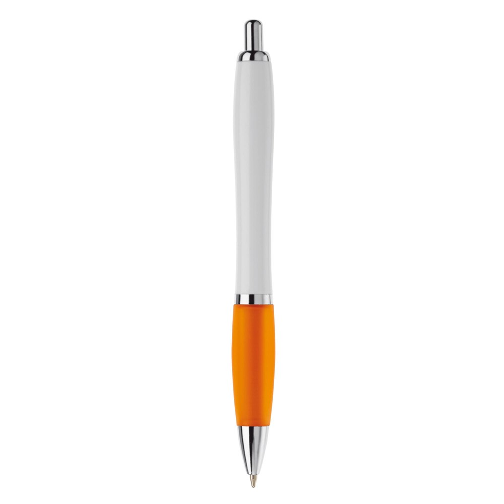 Witte balpen met metalen clip en metal look drukknop, ring en punt. De pen bevat een...meer