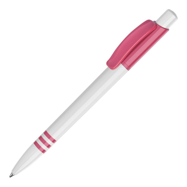 De Tropic balpen in hardcolour heeft een groot drukoppervlak op zowel de clip als de barrel. Met combinatie van een witte barrel en drukker en een gekleurde clip. De barrel bevat drie gekleurde ringen in dezelfde kleur als de clip. Inclusief een drukmechaniek en een blauw schrijvende Jumbo vulling. De pen is gemaakt van ABS kunststof, geproduceerd in Europa. Kleur combinaties voor deze pen zijn mogelijk vanaf 5.000 stuks.