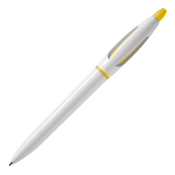 Hardcolour balpen S! met witte barrel en clip. De drukker en ring zijn gekleurd. Inclusief een X20 vulling met blauw schrijvende inkt. De pen bevat een drukmechaniek en is gemaakt van ABS kunststof. Geproduceerd in Europa. Kleur combinaties voor deze pen zijn mogelijk vanaf 5.000 stuks.