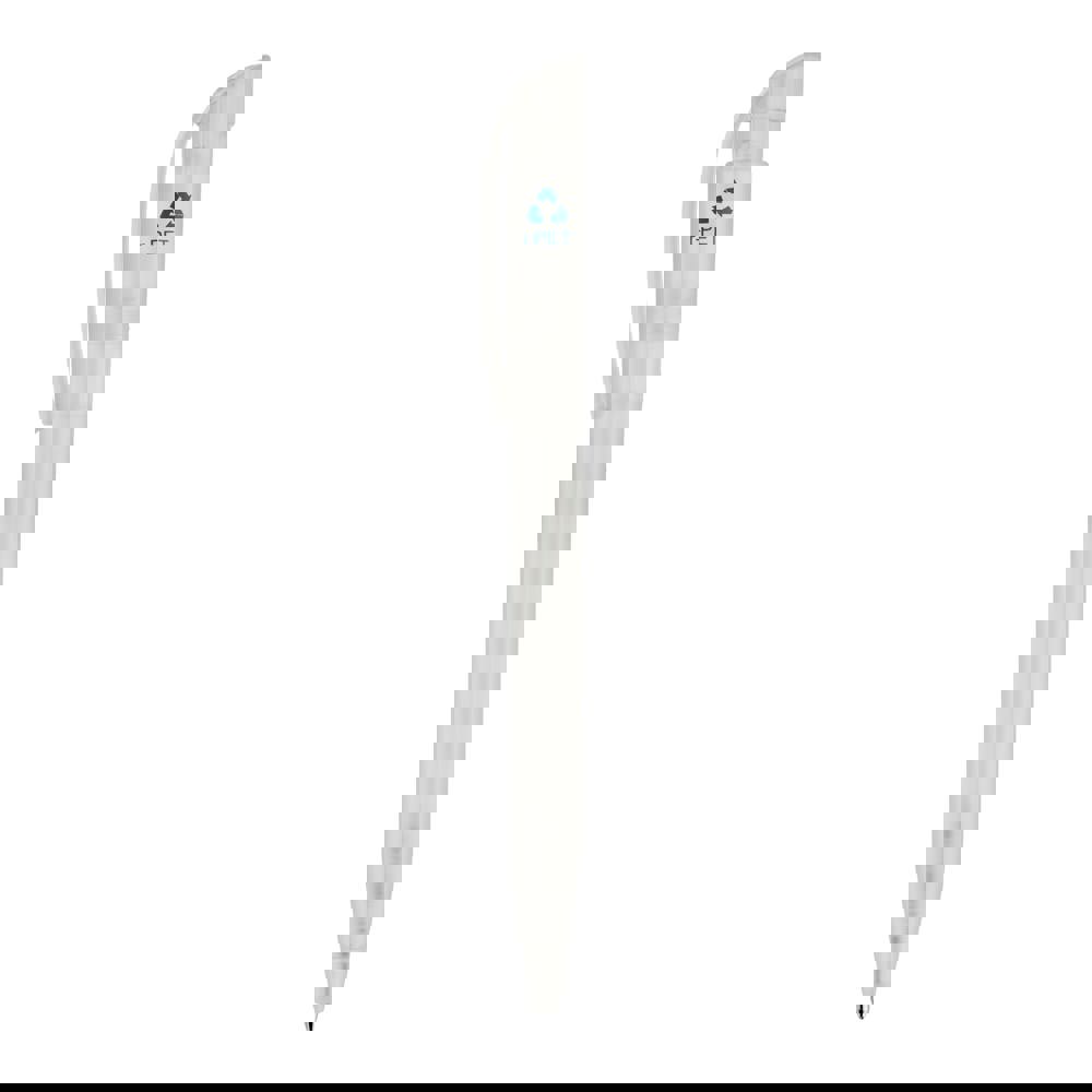 Moderne transparante balpen met boogclip, gemaakt van R-PET materiaal. R-PET betekend gerecycled PET kunststof. Door het grote drukoppervlak is het een uitstekend promotie artikel. Het bevat een drukmechaniek en een X20 vulling met blauw schrijvende inkt.