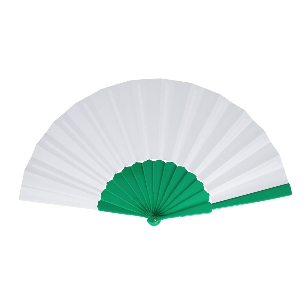 Waaier van kunststof en polyester. Verkrijgbaar in verschillende felle kleuren, ideaal voor buiten evenementen en hete zomerdagen.
