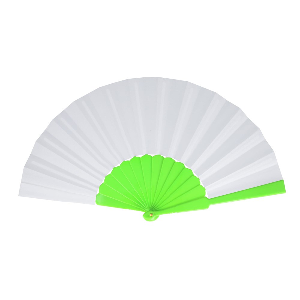 Waaier van kunststof en polyester. Verkrijgbaar in verschillende felle kleuren, ideaal voor buiten evenementen en hete zomerdagen.