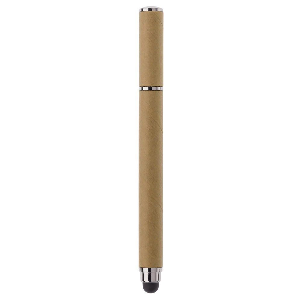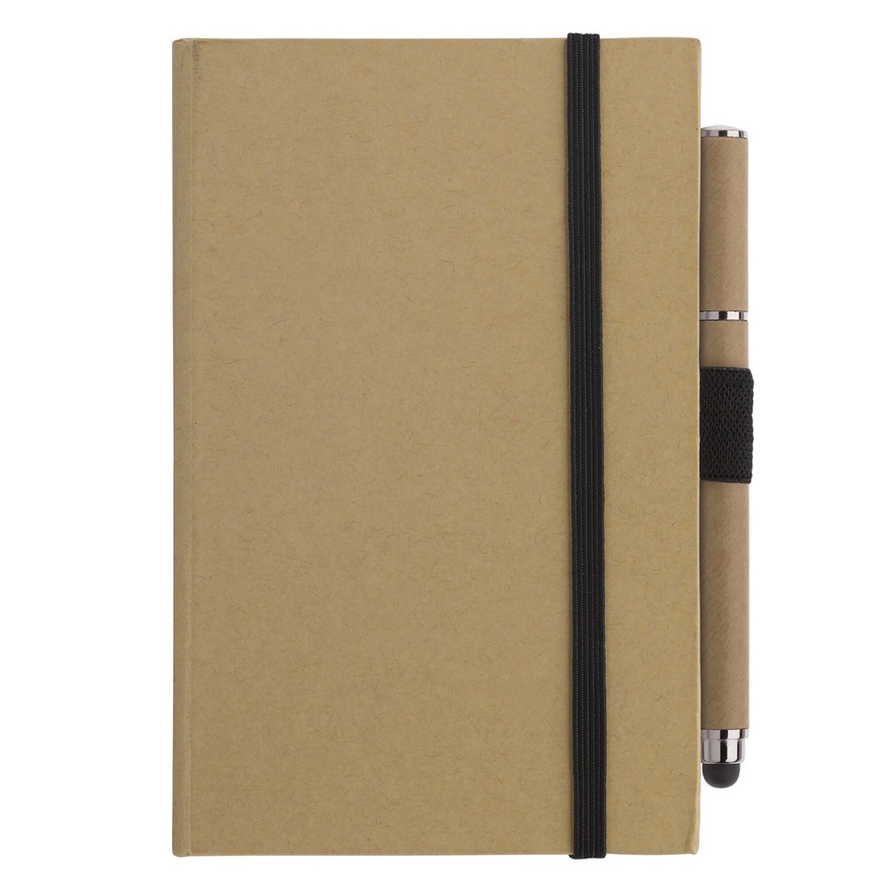 Notitieboek met kartonnen omslag in A6 formaat met elastiek en 160 gelinieerde crèmekleurige pagina's. Inclusief kartonnen styluspen.