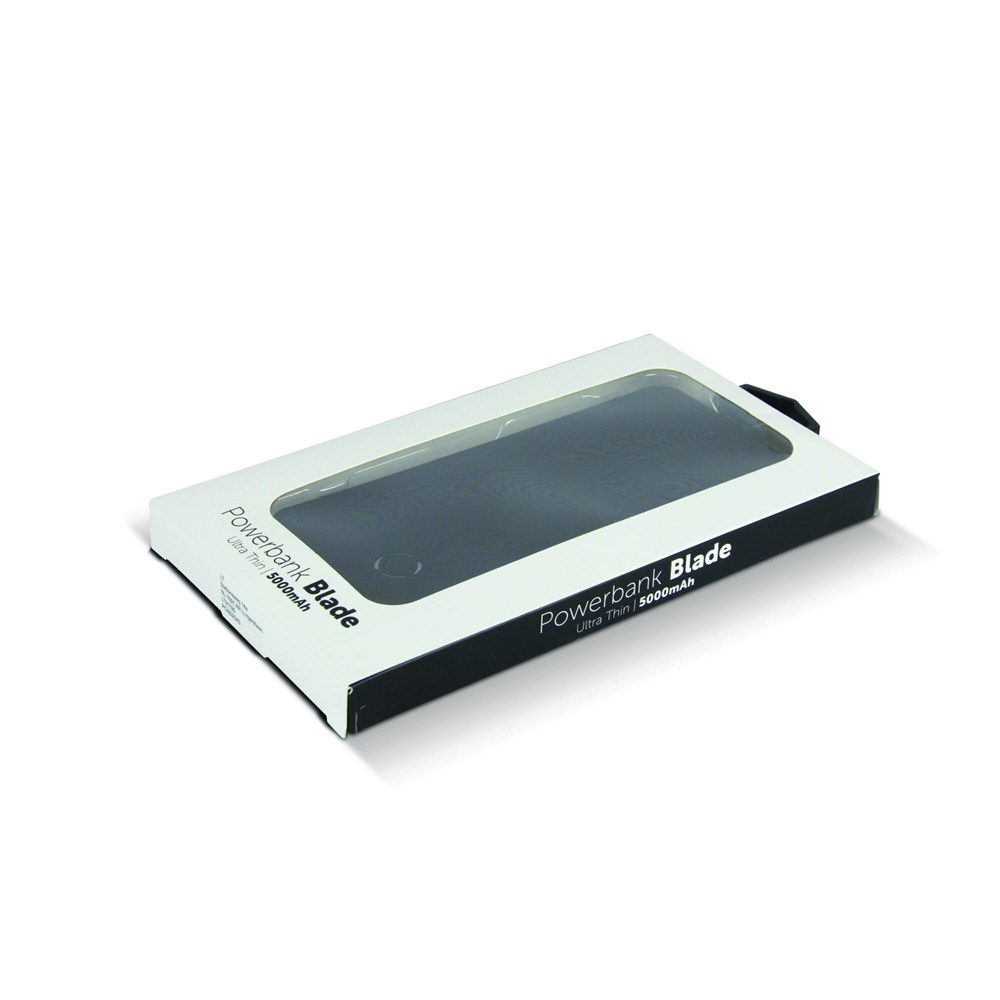 Ultradunne powerbank Blade (5000mAh) heeft een stijlvol design en is voorzien van een matte afwerking. Per stuk in geschenkverpakking verpakt.