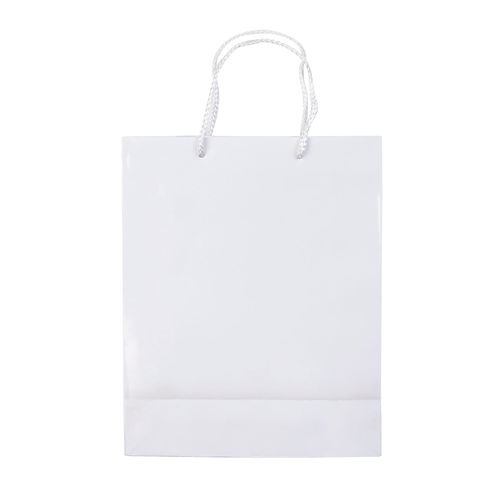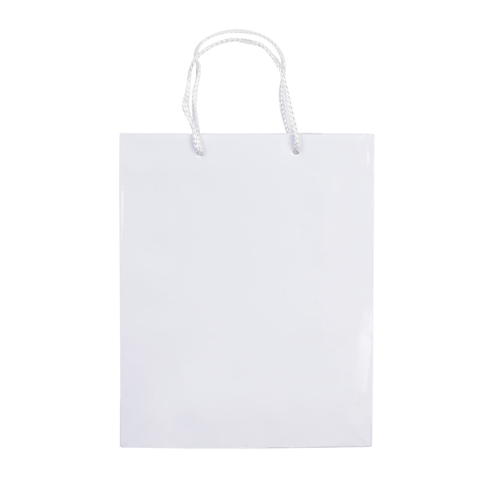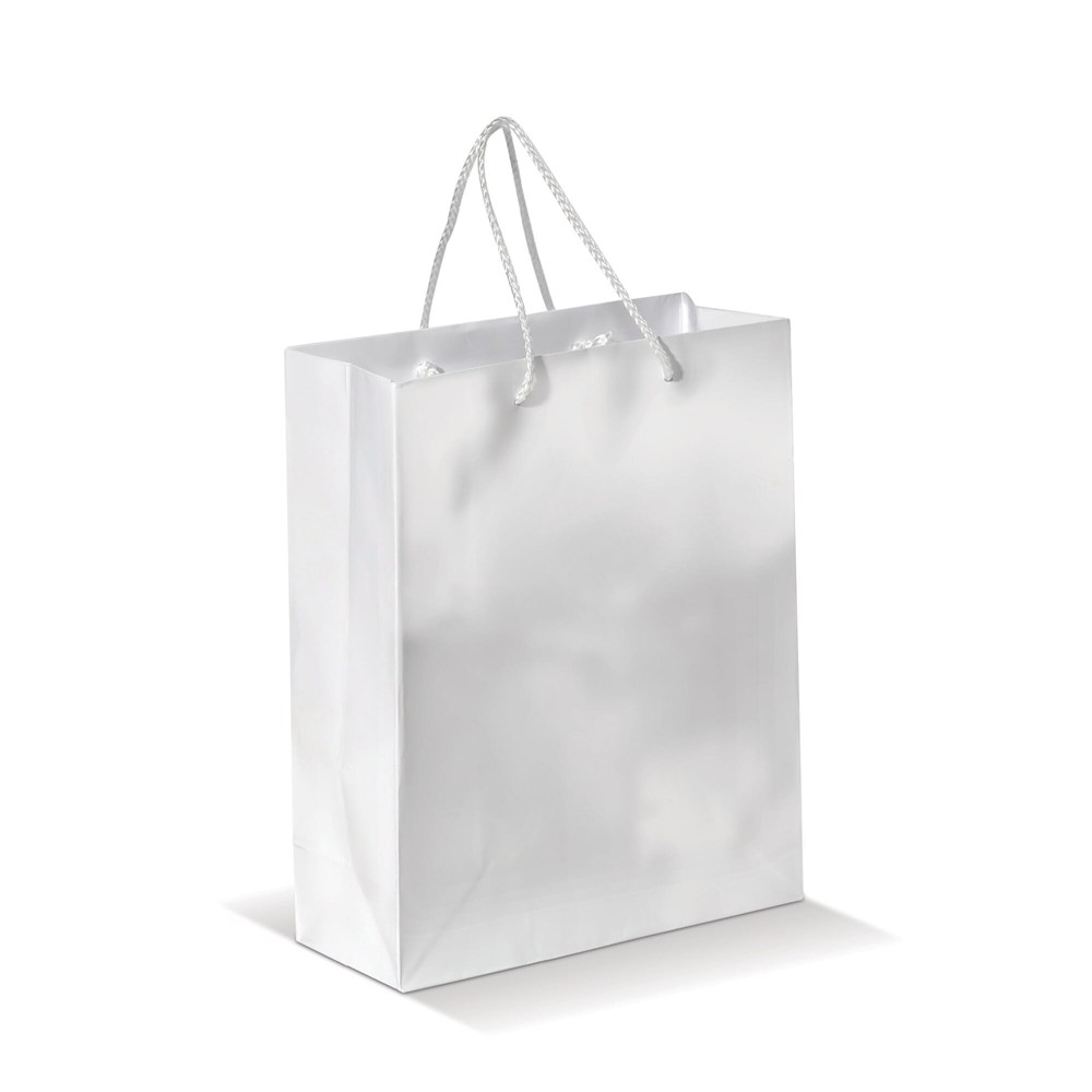 Middelgrote papieren tas met hengels van gevlochten touw in wit en zwart. Groot drukoppervlak aan beide zijden. Stevige tas. Glossy gelamineerd.