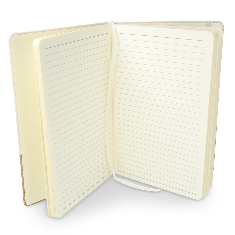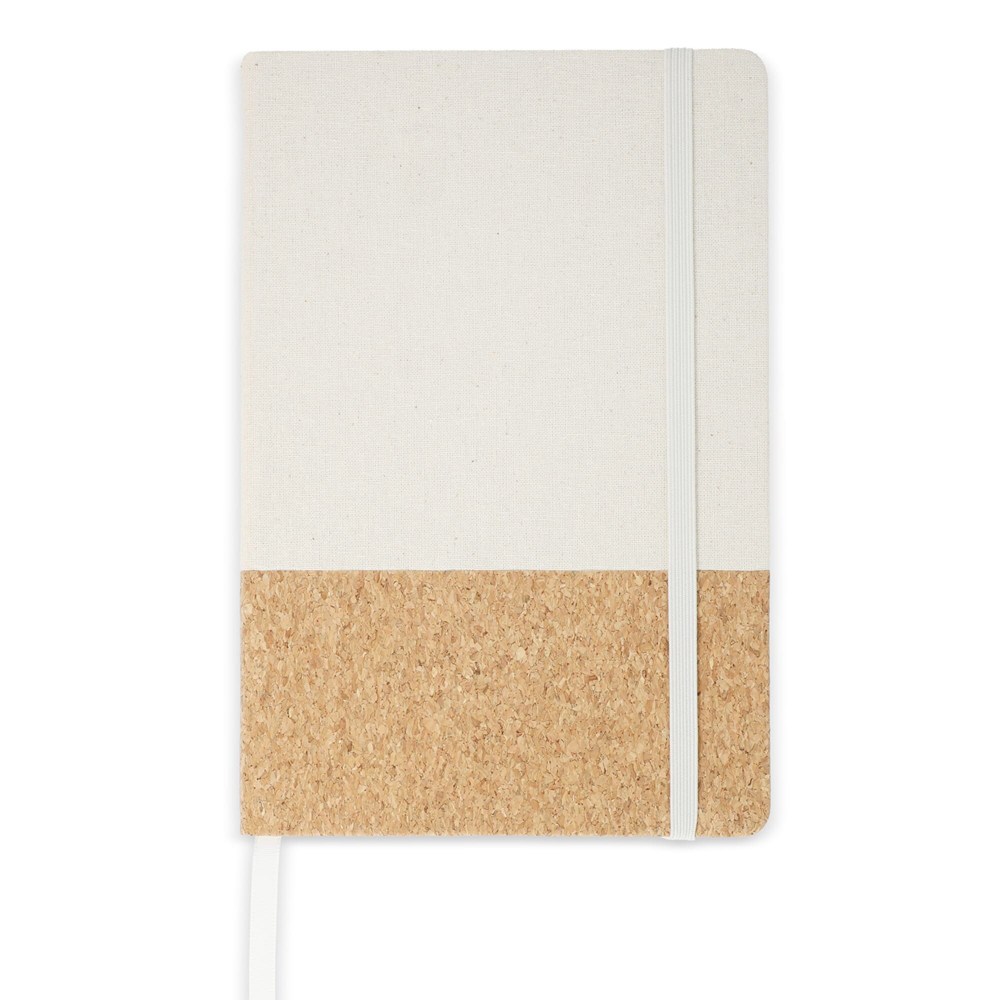 Dit notitieboek heeft een kaft van katoen en kurk met 80 gelinieerde vellen van 70g/m² FSC-gecertificeerd papier. Het heeft een sluiting met elastiek en een bladwijzer met lint voor extra gemak.