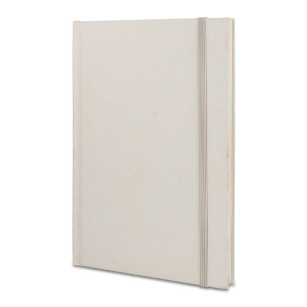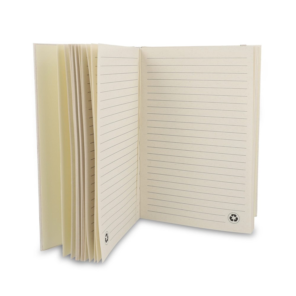 Dit duurzame A5-notitieboek heeft een omslag van gerecycled 120gsm melkpakpapier. Het bevat 80 vellen 70g/m² gelinieerd gerecycled melkpakpapier, met een sluiting van elastiek en een placemarker met lint.
