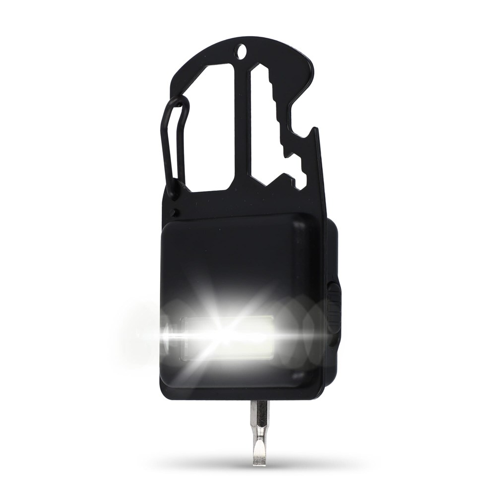Klem deze handige, multifunctionele tool in zakformaat aan je tas of riemlus, of gebruik de magneet om hem aan elk stalen oppervlak te bevestigen voor handsfree gebruik van de lamp. Deze tool heeft vijf extra functies: flesopener, moersleutel, COB-lamp, sterpuntschroevendraaier en platte schroevendraaier.