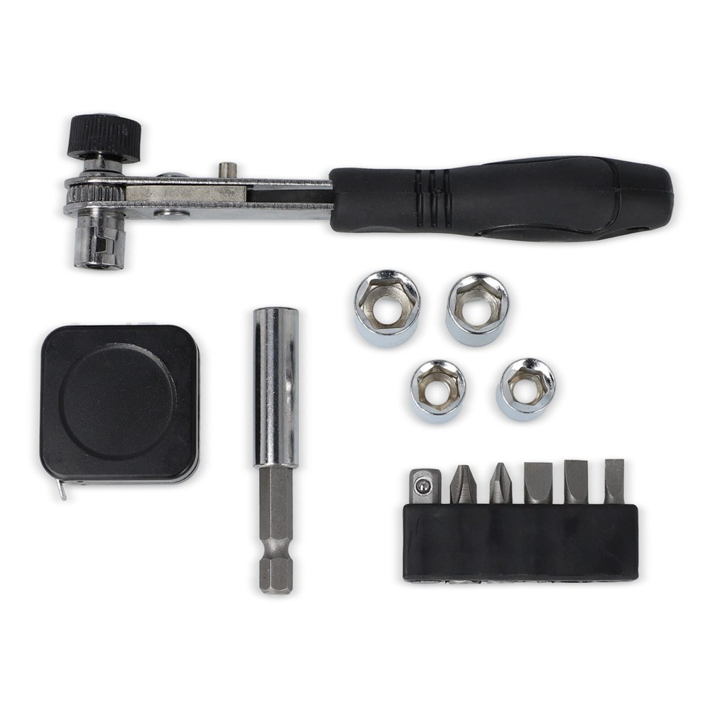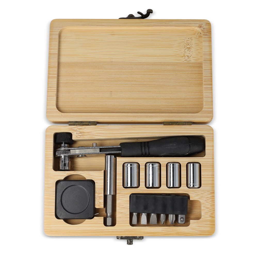 Handige 13-delige gereedschapsset in een bamboe doos: 1 x ratelsleutel; 1 x 1 m meetlint; 4 x 1/4 inch doppen; 5 x 25 mm schroevendraaier bits; 1 x ADP & 1 x schroevendraaier connector
