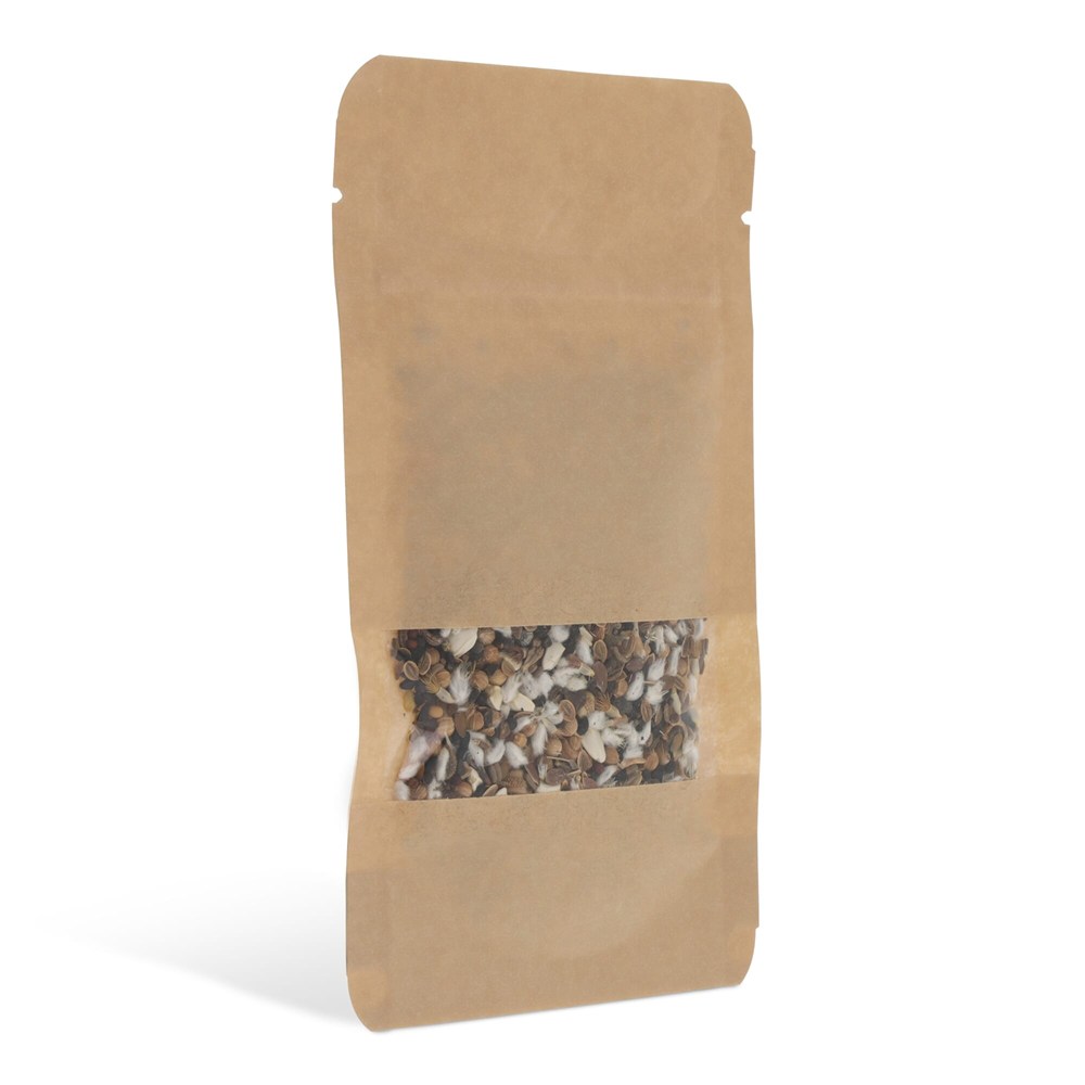 Kraft papieren zak met 4 gram droogbloemenzaden geschikt voor 2 m² bloemen. Een echt duurzaam cadeau.