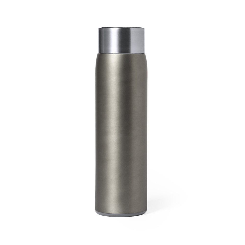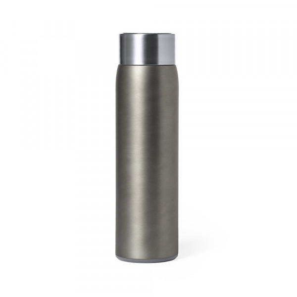 Dubbelwandige thermische fles van roestvrij staal, met een aanraakgevoelige temperatuurmeter geïntegreerd in het deksel. Inhoud van 500 ml en matte afwerking. Met BPA-vrij veiligheidsdeksel en gepresenteerd in een aantrekkelijke designdoos. Werkt op batterijen (knoopcel inbegrepen) en gebruiksaanwijzing beschikbaar in het Engels en Spaans.