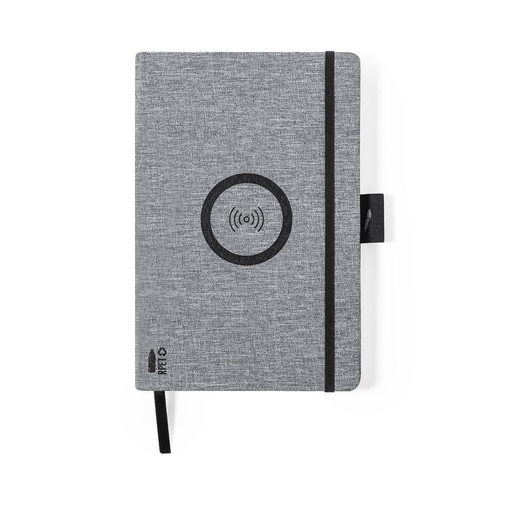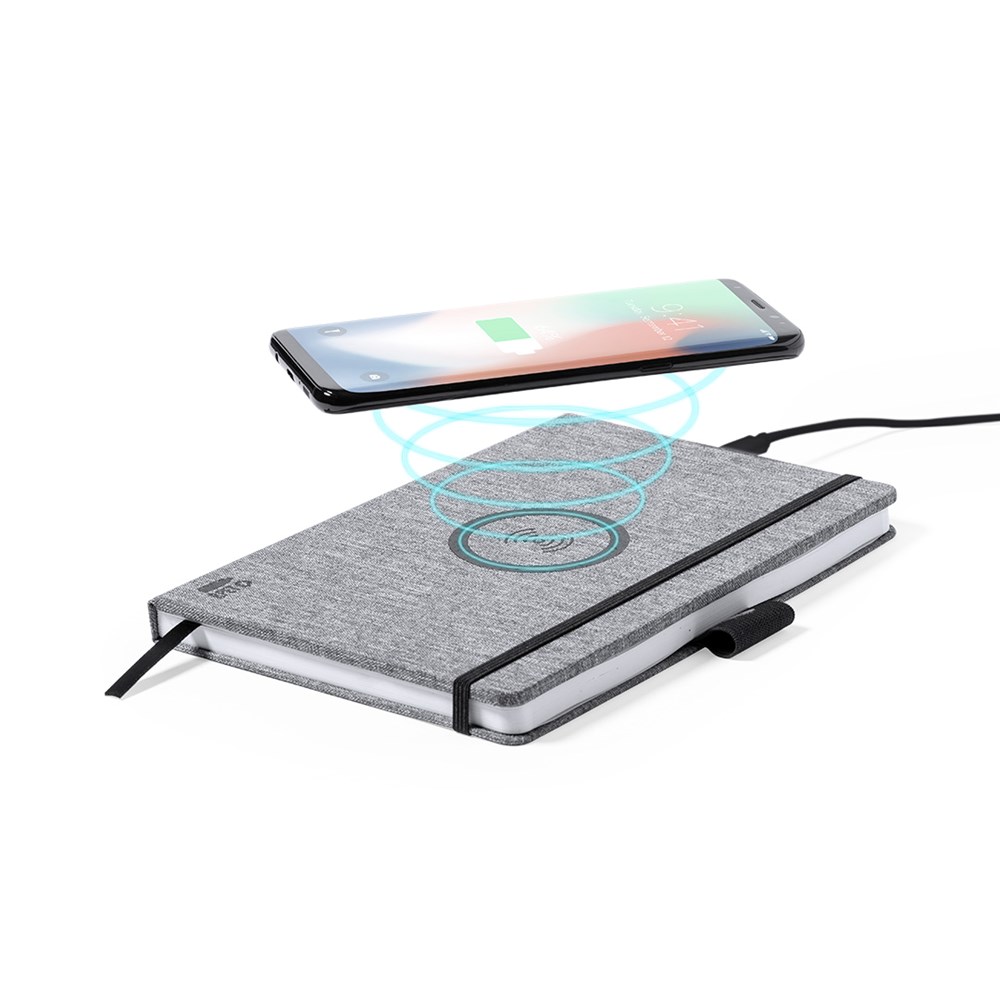 Natuurlijn A5-notitieblok van duurzaam 300D RPET-polyester, gemaakt van gerecycled plastic om het hergebruik van plastic afval aan te moedigen en de duurzaamheid van de planeet te helpen. Met 10W draadloze oplader geïntegreerd in de omslag. Inclusief 80 vellen met single-stripe lay-out. Compatibel met smartphones met draadloze oplaadtechnologie. Type C oplaadkabel en gebruiksaanwijzing in het Engels en Spaans.