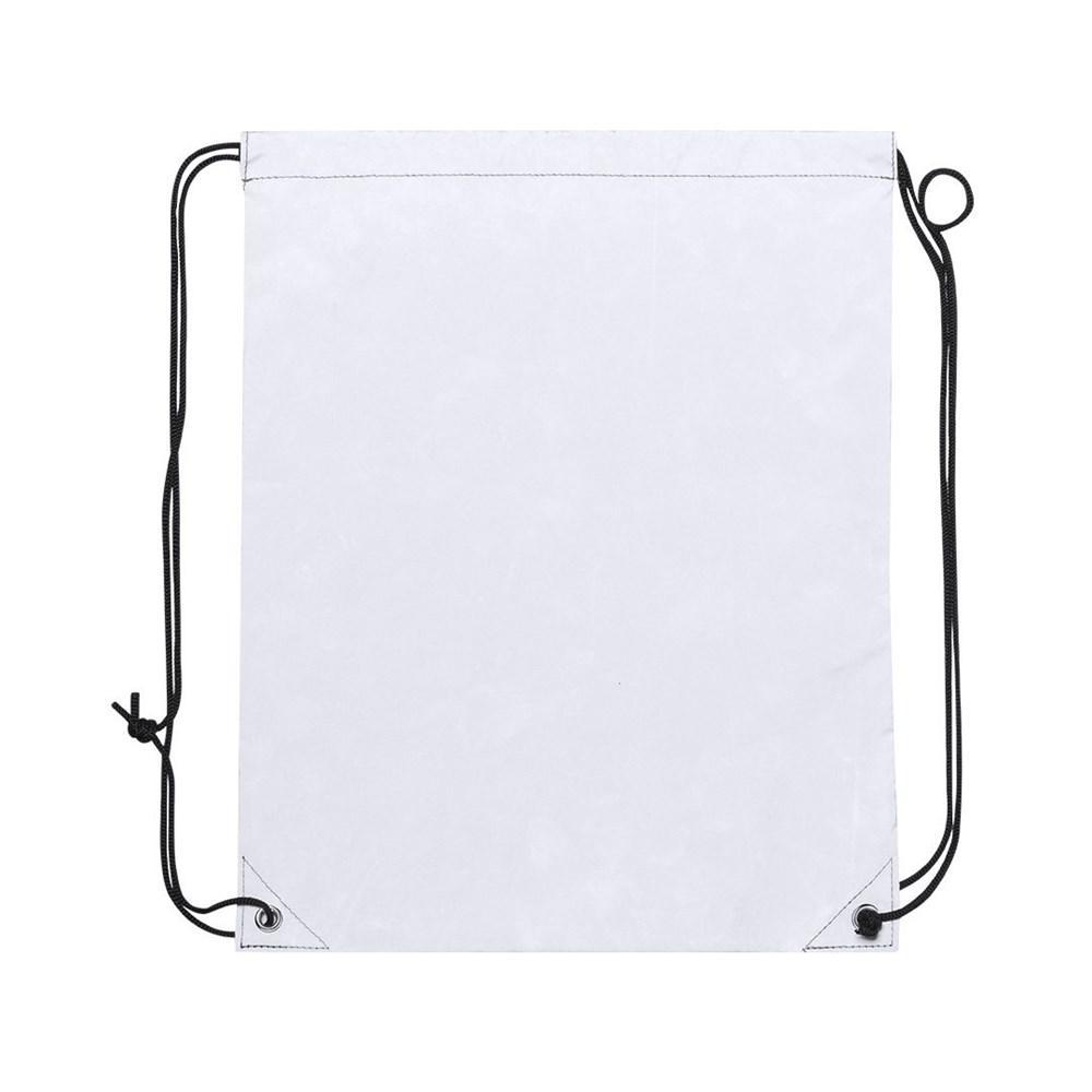 Rugzak met koord in zacht 210T polyester. Gemaakt van sterk reflecterende stof, gebaseerd op het principe van retro-reflectie van licht, een eigenschap van nachtelijke zichtbaarheid die bestaat uit de breking van licht terug naar de bron van oorsprong. Met zwarte zelfsluitende koorden en metalen oogjes. Bestand tegen een gewicht tot 7 kg en waterdicht.