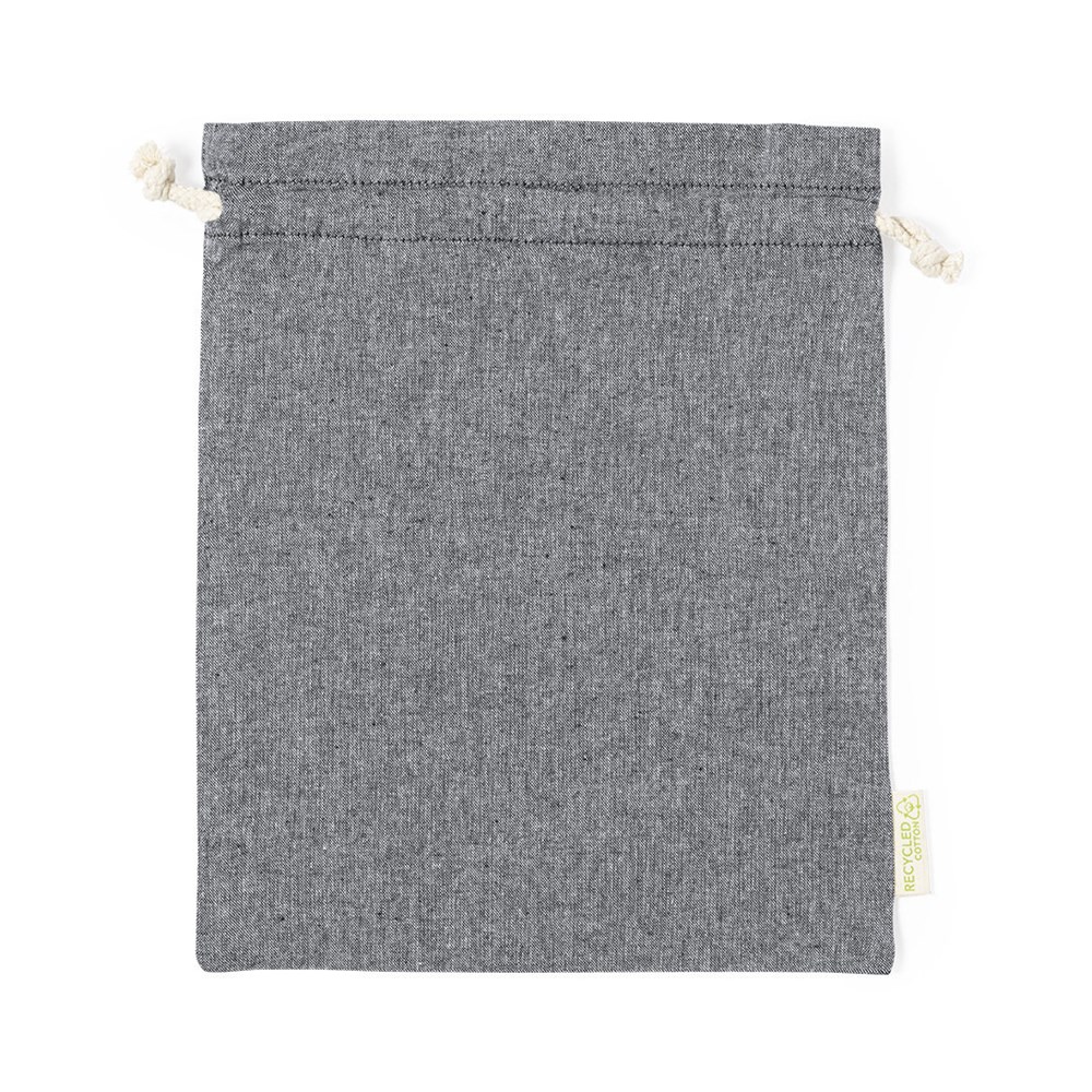 Milieuvriendelijke tas van resistent gerecycled katoenmateriaal van 120g/m2. GRS-certificaat (Global Recycled Standard), garandeert de gerecyclede herkomst van het materiaal dat voor de vervaardiging van het product is gebruikt. Katoenen trekkoordsluiting en gestikte afwerking, inclusief etiket aan de buitenkant met logo van gerecycled katoen.