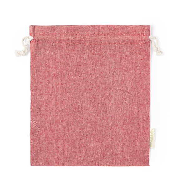 Milieuvriendelijke tas van resistent gerecycled katoenmateriaal van 120g/m2. GRS-certificaat (Global Recycled Standard), garandeert de gerecyclede herkomst van het materiaal dat voor de vervaardiging van het product is gebruikt. Katoenen trekkoordsluiting en gestikte afwerking, inclusief etiket aan de buitenkant met logo van gerecycled katoen.