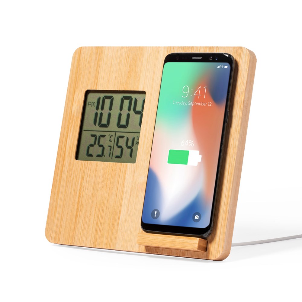 Natuurlijn weerstation met geïntegreerde 10W draadloze oplader. Gemaakt van gepolijst bamboe, met thermometer en hygrometer functies. Inclusief 1m Micro USB oplaadkabel en compatibel met apparaten die zijn uitgerust met draadloze oplaadtechnologie. Batterijgevoede klok (celknop inbegrepen) en gepresenteerd in een aantrekkelijke eco-design doos. Gebruiksaanwijzing beschikbaar in het Engels en Spaans.