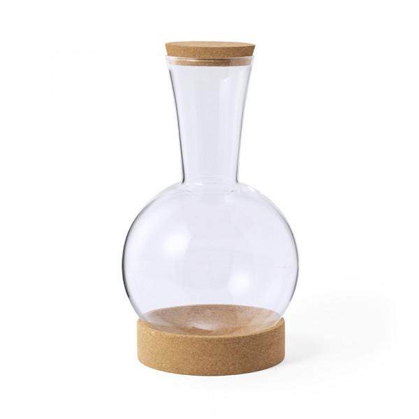Natuurlijn karaf van borosilicaatglas, met bodem en deksel van natuurkurk. Met een inhoud van 1,7 liter en gepresenteerd in een individuele, eco-designed doos.