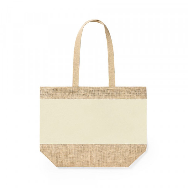 Tas van duurzame combinatie van gelamineerd jute en gelamineerd katoen, met natuurlijke katoenen handvatten. Gestikte afwerking met lange, versterkte handvatten, en verkrijgbaar in een brede waaier van kleuren. Bestand tegen een gewicht tot 10 kg.