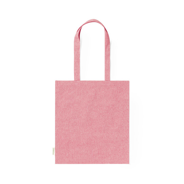 Tas gemaakt van gerecycled katoen materiaal 140g/m2. GRS-certificaat (Global Recycled Standard), dat de gerecycleerde herkomst garandeert van het materiaal dat voor de vervaardiging van het product is gebruikt. Gestikte afwerking, met een lengte van 70 cm, versterkte handgrepen, en verkrijgbaar in een brede waaier van kleuren. Weerstand tot 8 kg, inclusief embleem van gerecycleerd katoen op het etiket.