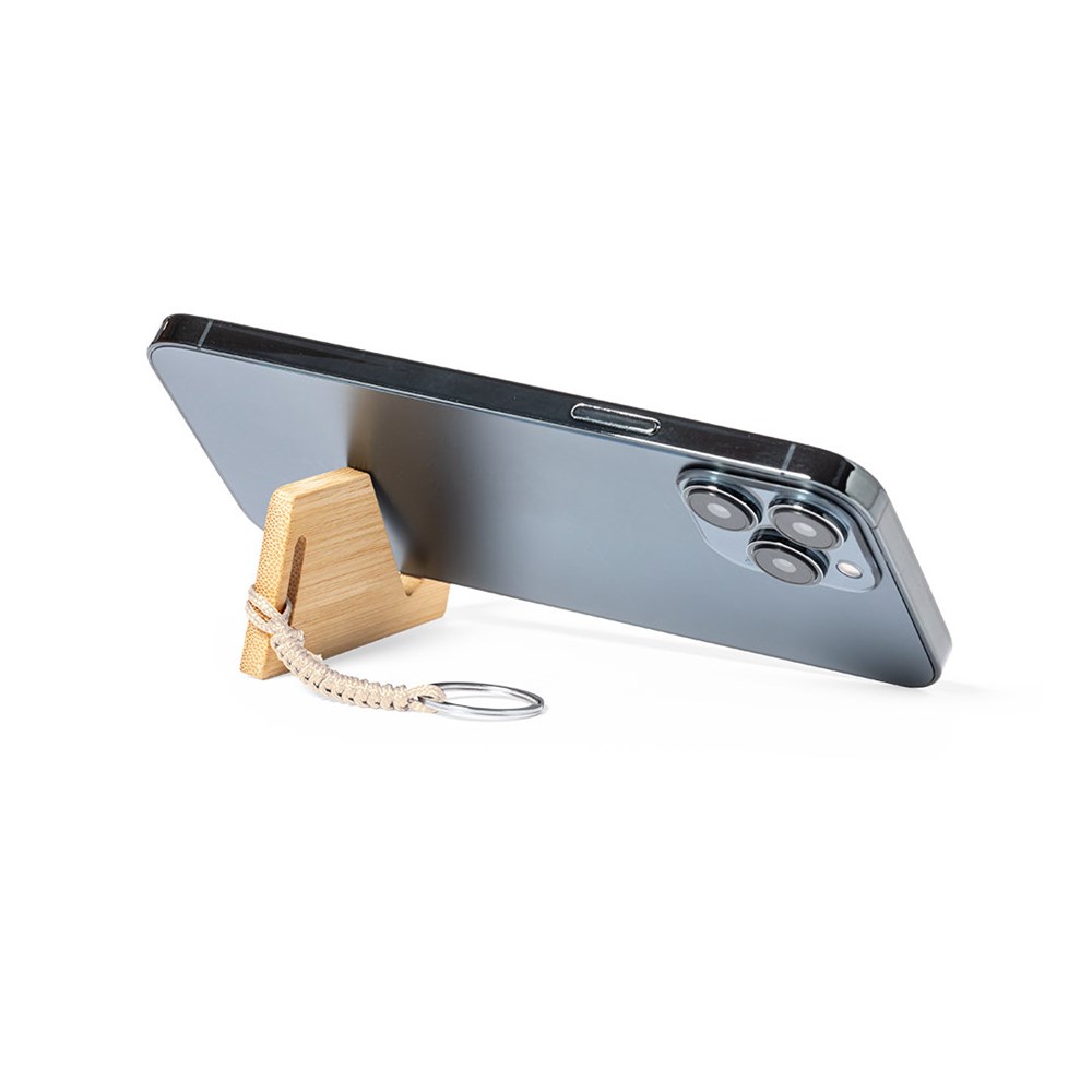 Natuurlijn sleutelhanger gemaakt in bamboe, met geïntegreerde smartphonehouder en origineel touwtje. Gepresenteerd in individueel zakje met eco karton binnenin.